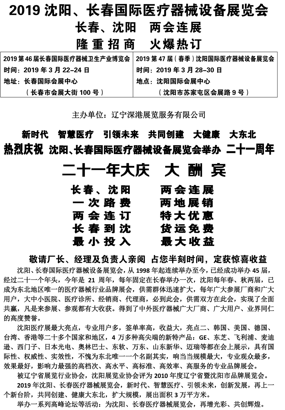 | 2019沈陽、長春醫(yī)療器械設備展覽會 兩會連展 特大優(yōu)惠! | |