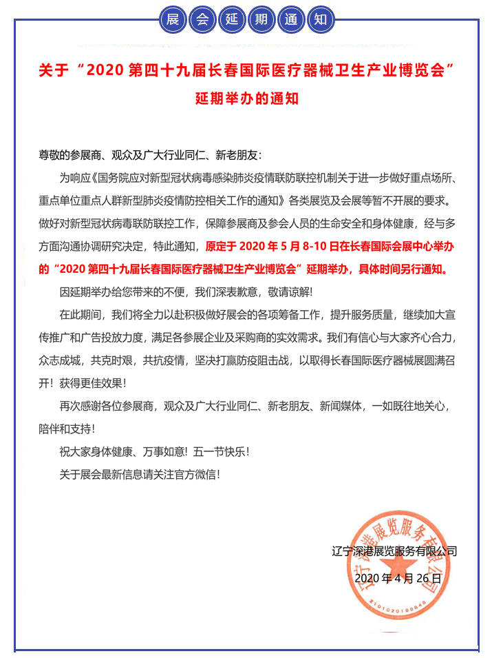 | 【重要通知】關(guān)于“2020第四十九屆長春國際醫(yī)療器械衛(wèi)生產(chǎn)業(yè)博覽會”延期舉辦的通知 | |
