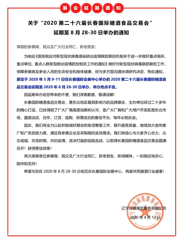 | 【重要通知】關(guān)于“2020第二十六屆長(zhǎng)春國(guó)際糖酒食品交易會(huì)”延期至8月28-30日舉辦的通知 | |