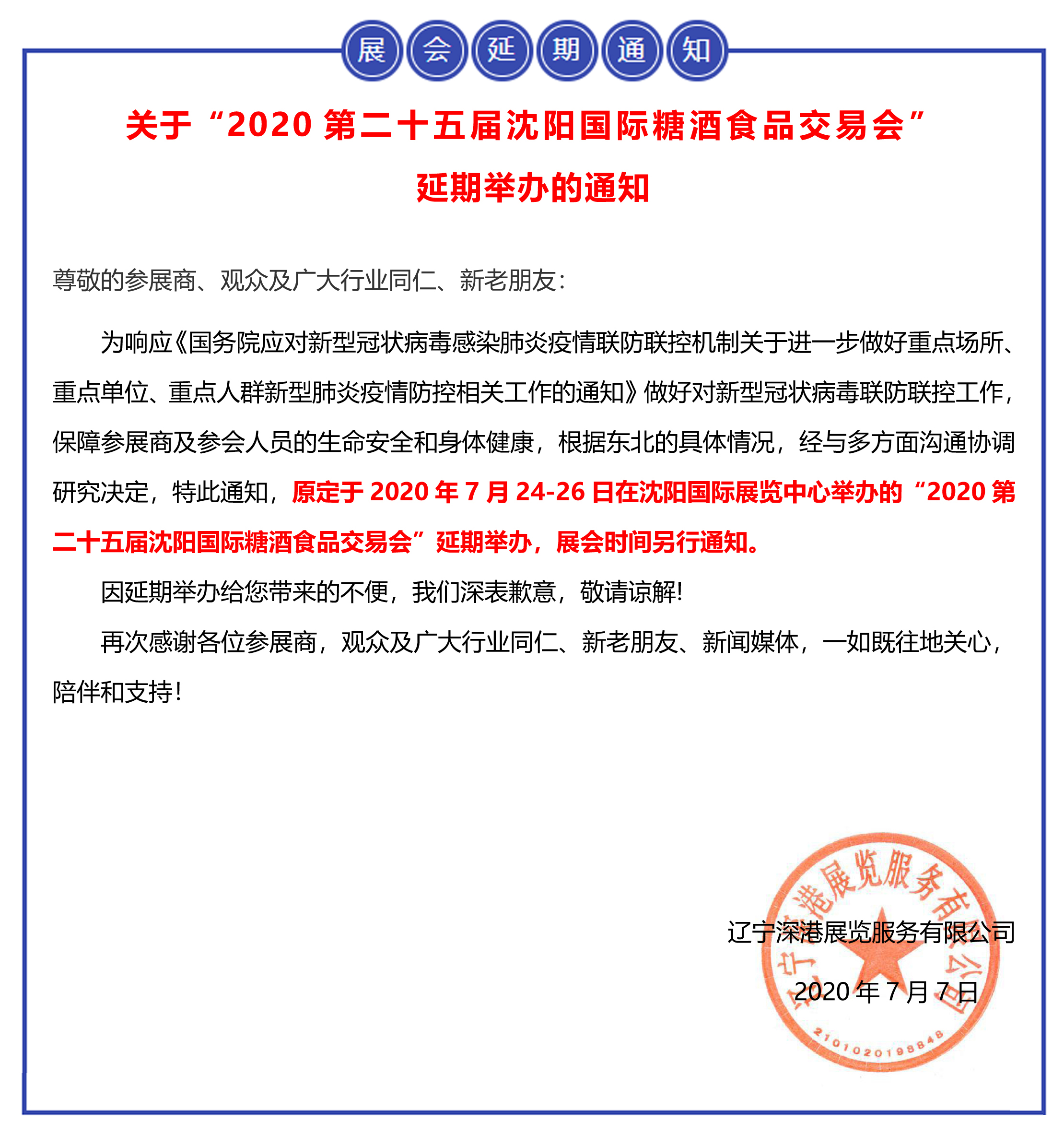 【重要通知】關(guān)于“2020第二十五屆沈陽國際糖酒食品交易會” 延期舉辦的通知