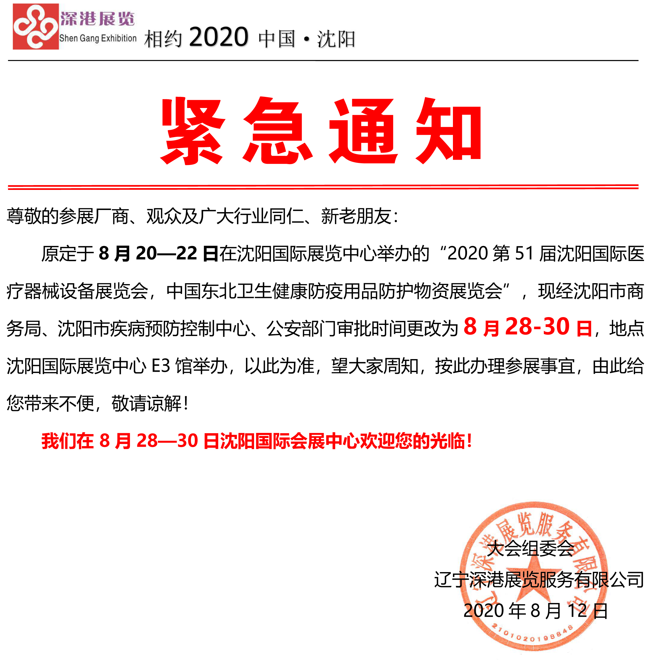 | 【緊急通知】2020沈陽醫(yī)療器械展更改為8月28-30日在沈陽國際展覽中心舉辦?。?! | |
