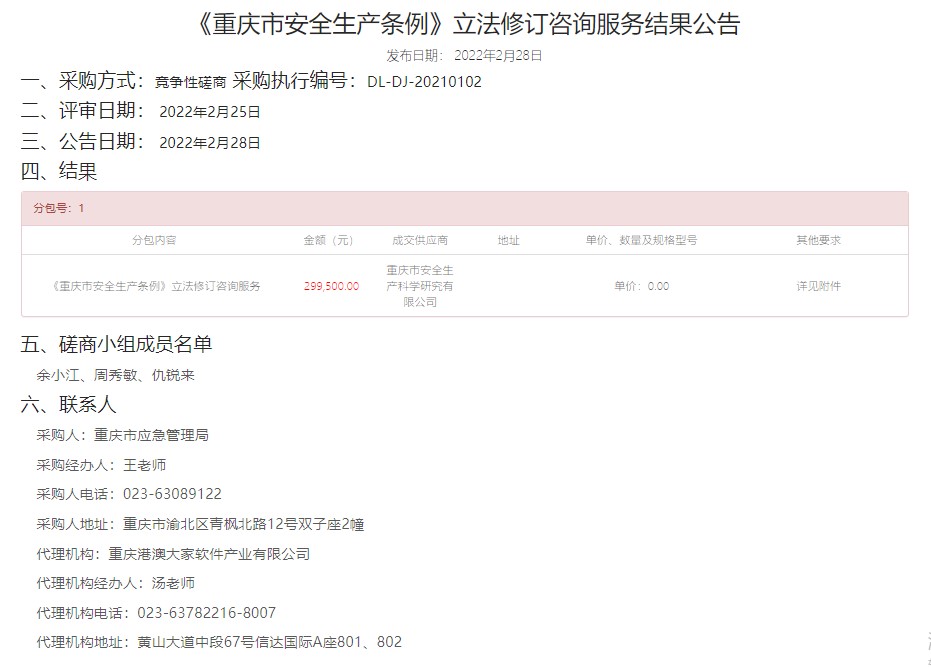 2月28日,“《重慶市安全生產(chǎn)條例》立法修訂咨詢服務(wù)”項(xiàng)目投標(biāo)結(jié)果在“行采家”網(wǎng)上進(jìn)行了公示,公司為中標(biāo)人。到目前為止,公示期結(jié)束,正式確定公司中標(biāo)該項(xiàng)目。
