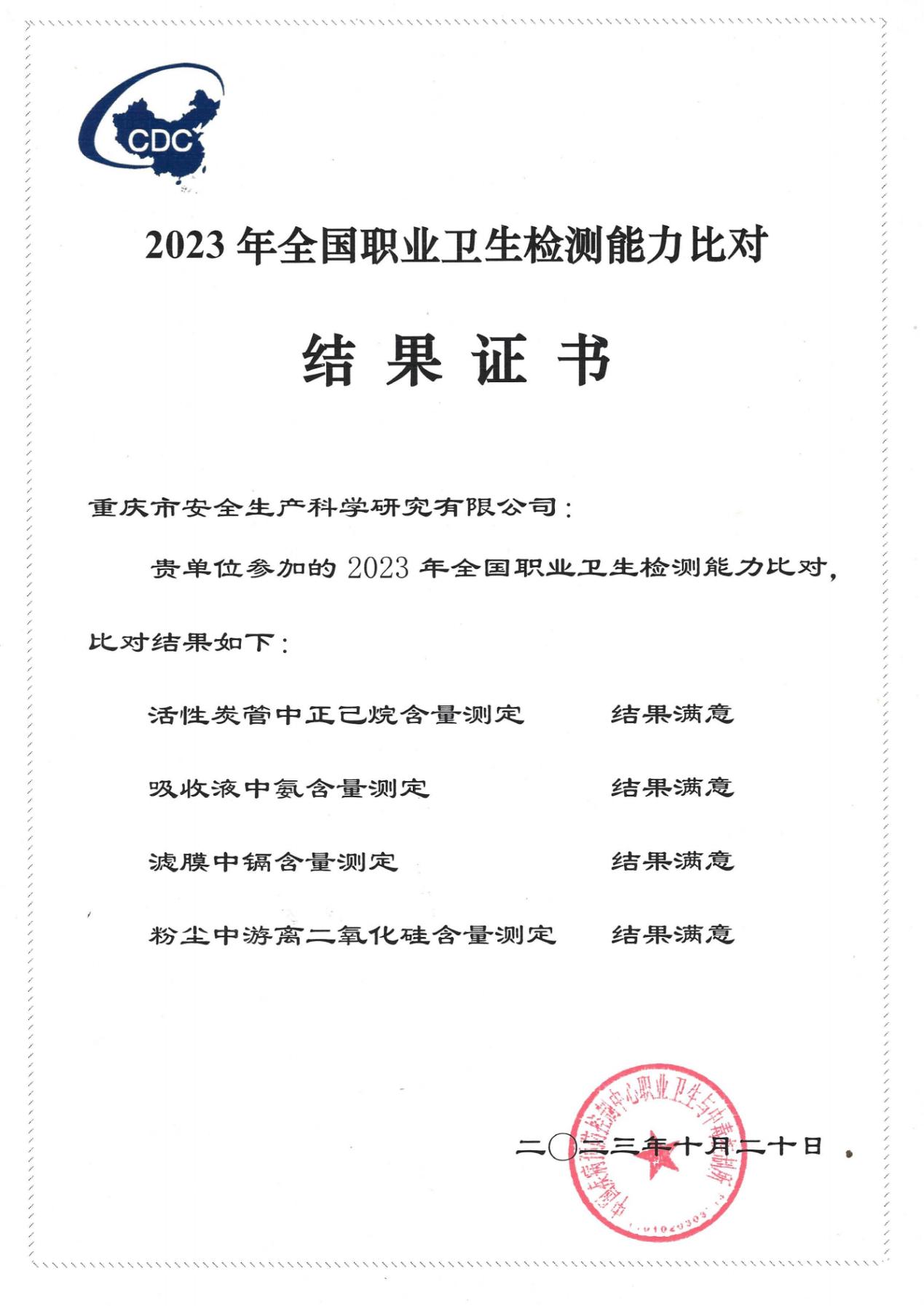 近日,中國疾病預(yù)防控制中心通報(bào)了2023年全國職業(yè)衛(wèi)生檢測能力比對結(jié)果,重慶市安全生產(chǎn)科學(xué)研究有限公司參與的所有項(xiàng)目全部一次性考核通過,結(jié)果均為優(yōu)秀,并獲得中國疾病預(yù)防控制中心頒發(fā)的比對滿意證書。