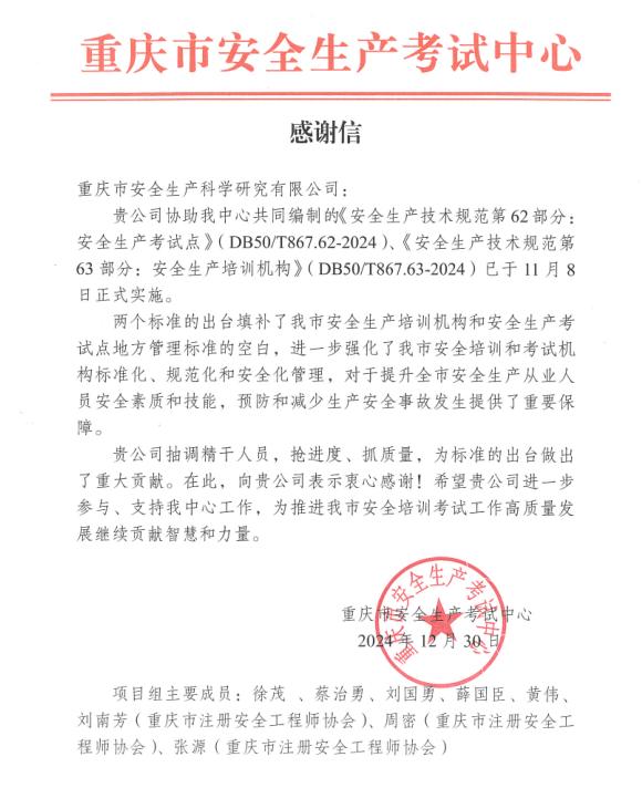 近日,重慶市安全生產(chǎn)考試中心給我公司發(fā)來感謝信,對(duì)公司在編制《重慶市安全生產(chǎn)技術(shù)規(guī)范-安全生產(chǎn)考試點(diǎn)》《重慶市安全生產(chǎn)技術(shù)規(guī)范-安全生產(chǎn)培訓(xùn)機(jī)構(gòu)》等兩部地方標(biāo)準(zhǔn)中所做的工作給予了充分肯定。