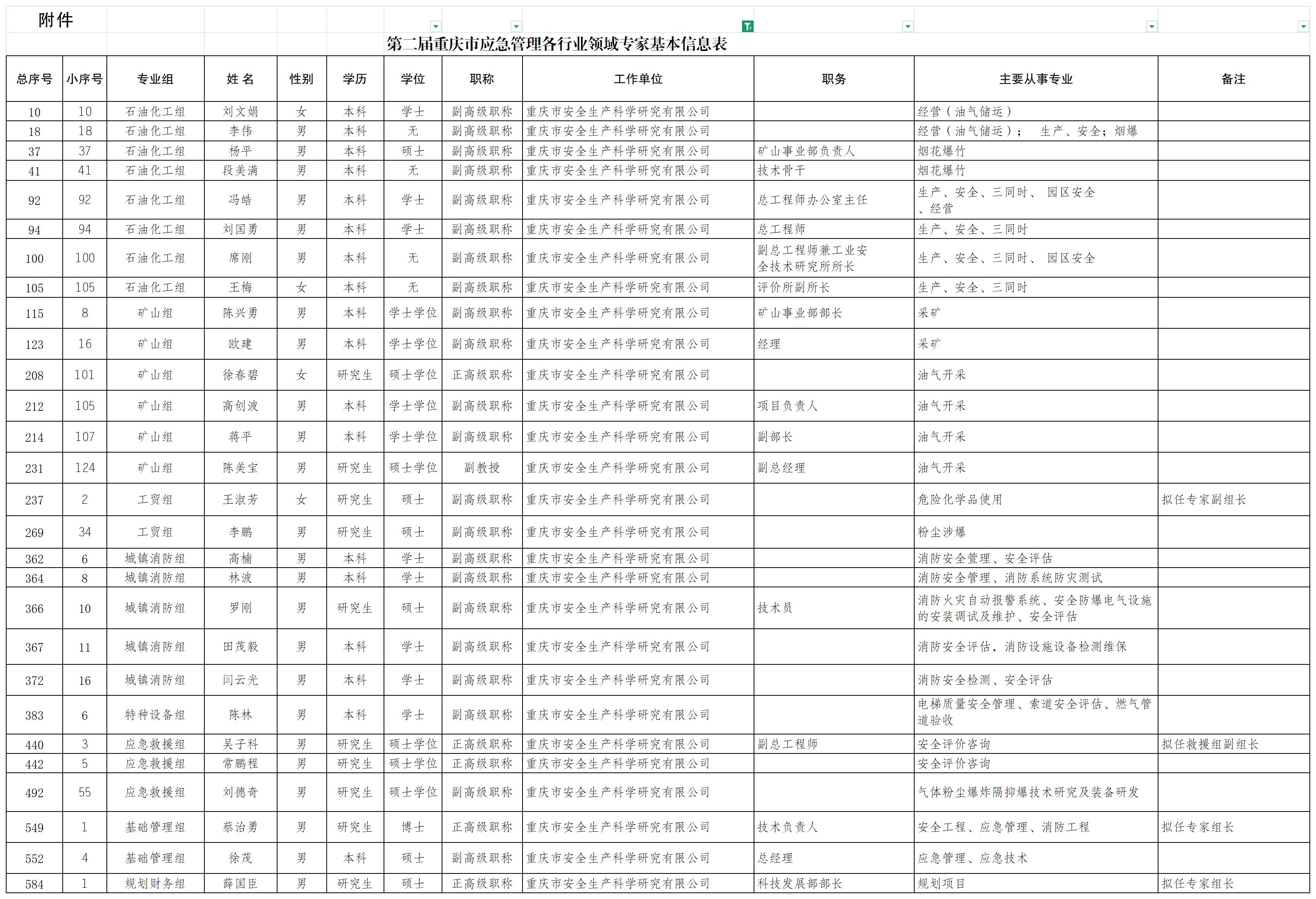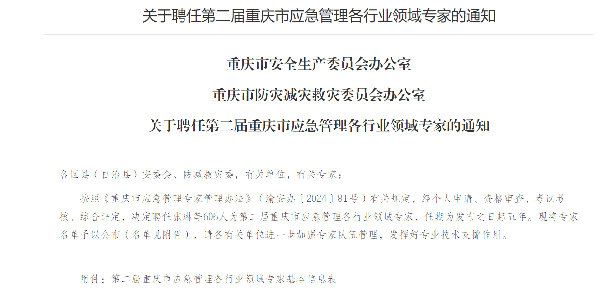 近日,重慶市安全生產(chǎn)委員會辦公室、重慶市防災(zāi)減災(zāi)救災(zāi)委員會辦公室發(fā)布了關(guān)于聘任第二屆重慶市應(yīng)急管理各行業(yè)領(lǐng)域?qū)<业耐ㄖ焦剂酥貞c市第二屆應(yīng)急管理專家名單。本次聘任專家共計(jì)606人,其中公司有28人入選。