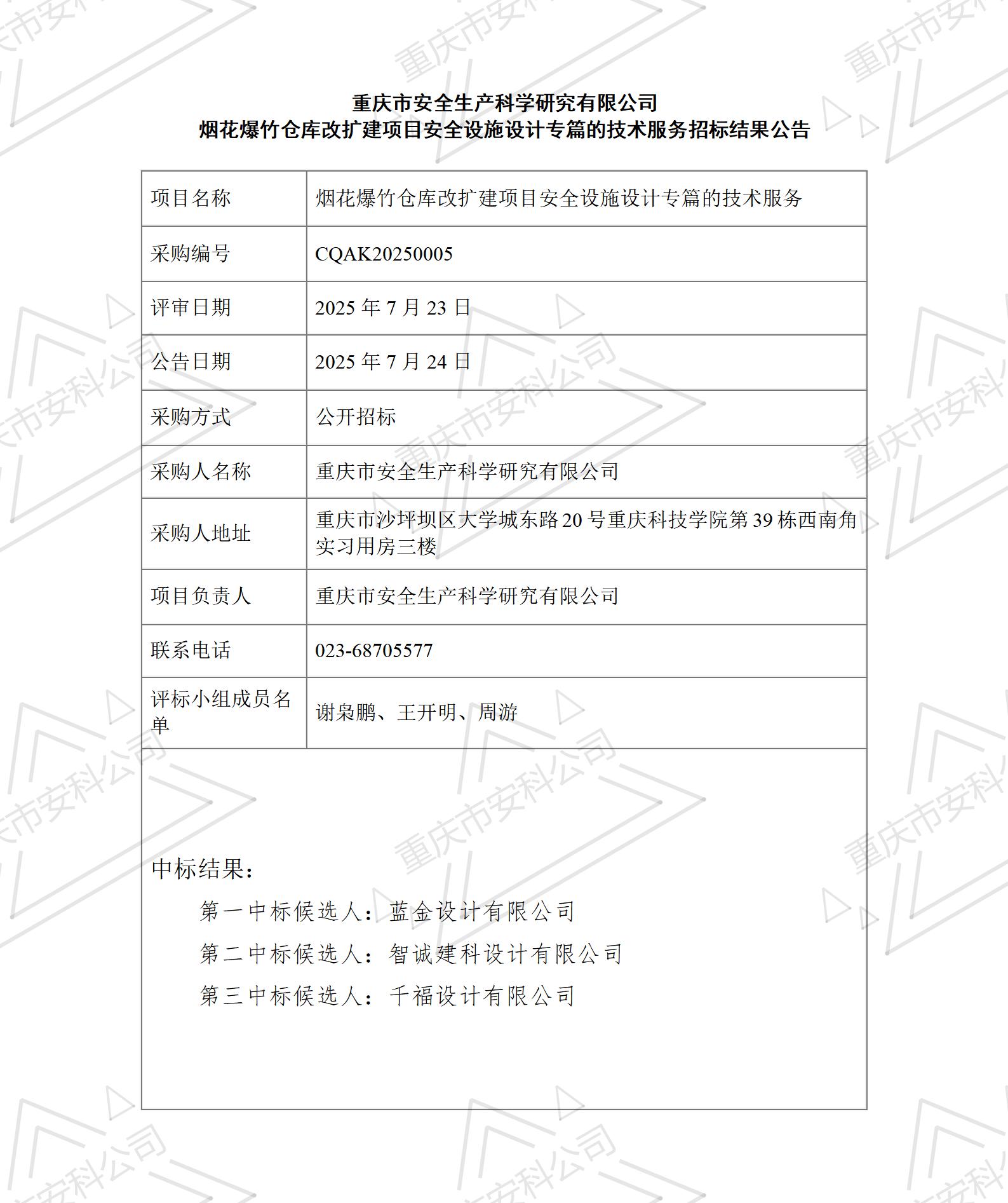 公司煙花爆竹倉庫改擴(kuò)建項(xiàng)目安全預(yù)評價技術(shù)服務(wù)招標(biāo)結(jié)果公告