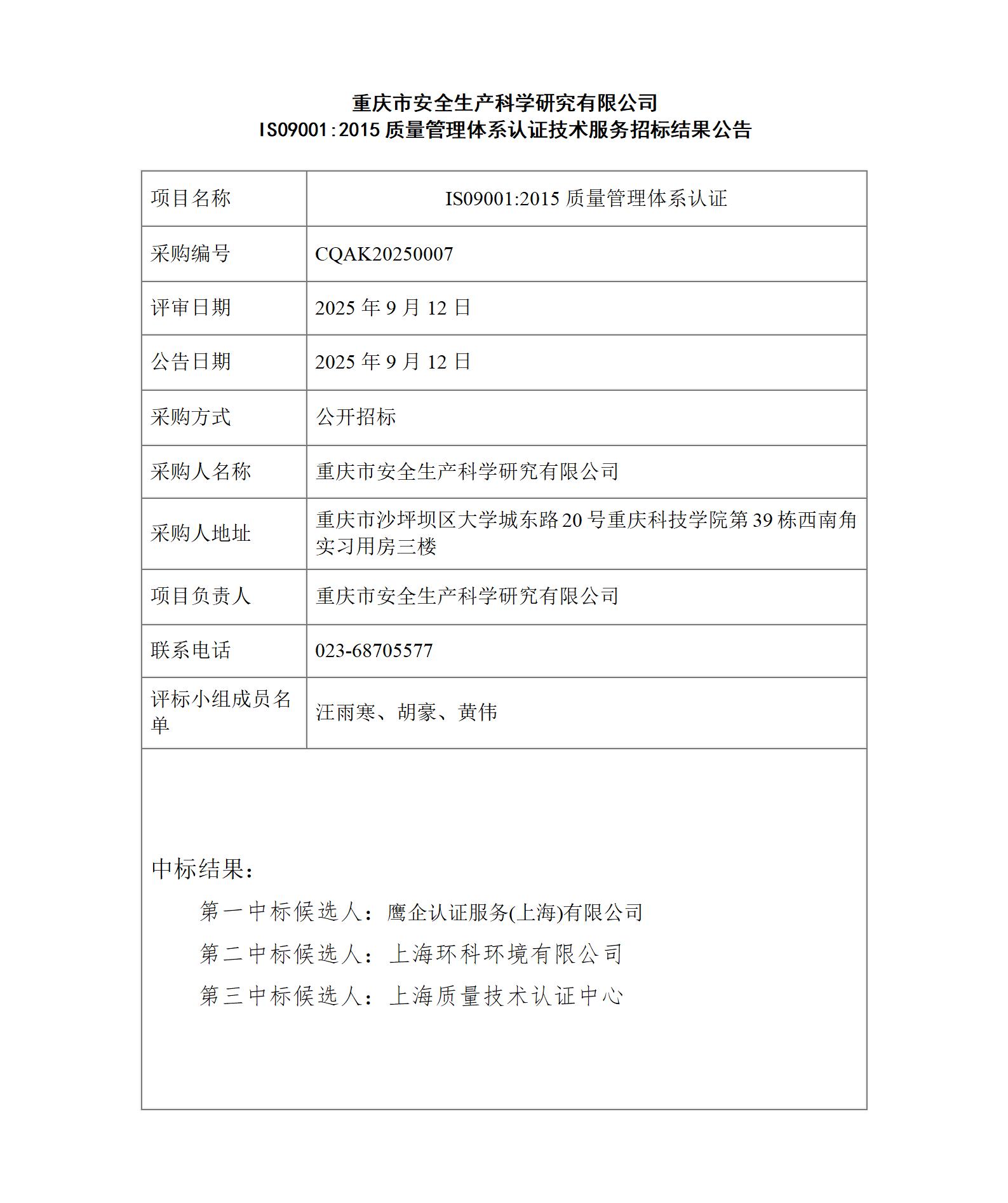 重慶市安全生產(chǎn)科學研究有限公司IS09001:2015質(zhì)量管理體系認證技術(shù)服務(wù)招標結(jié)果公告
